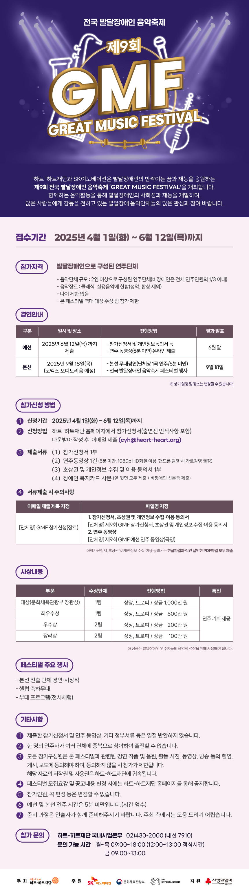 기타 [모집 기한 연장] [하트-하트재단] 제9회 전국 발달장애인 음악축제 'GREAT MUSIC FESTIVAL' 참가 음악단체 모집(~6/12)