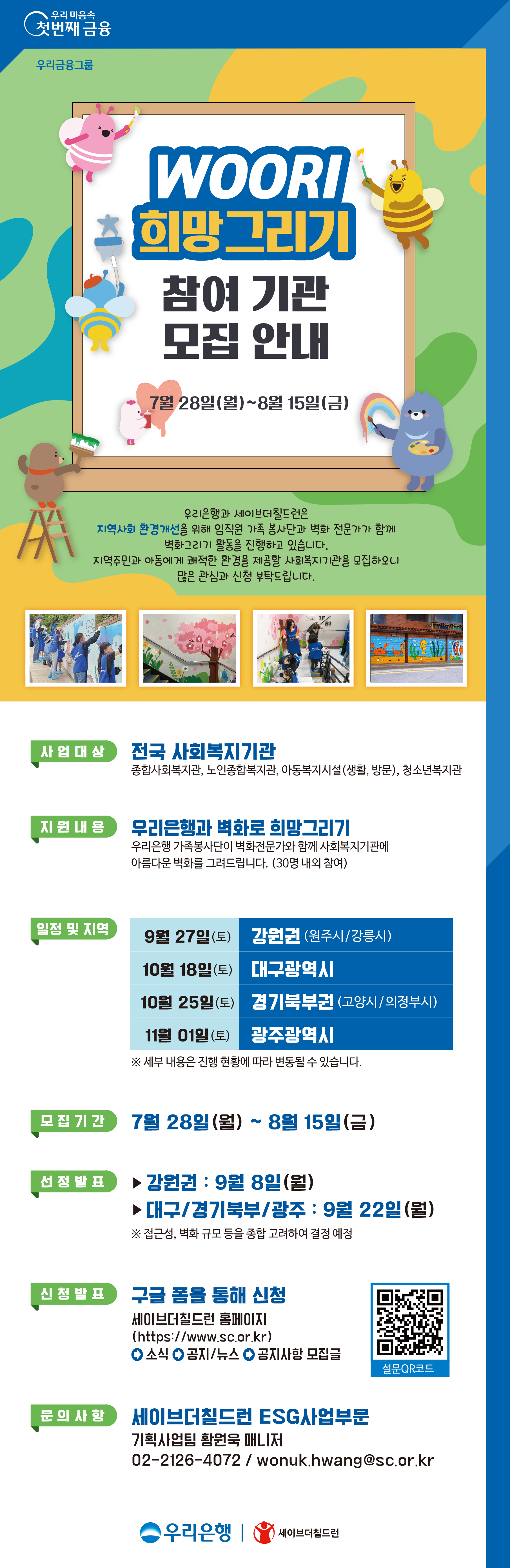 1. [우리은행X세이브더칠드런] 임직원 가족 봉사단 벽화 그리기 봉사활동 사업 신청 안내문 1부.