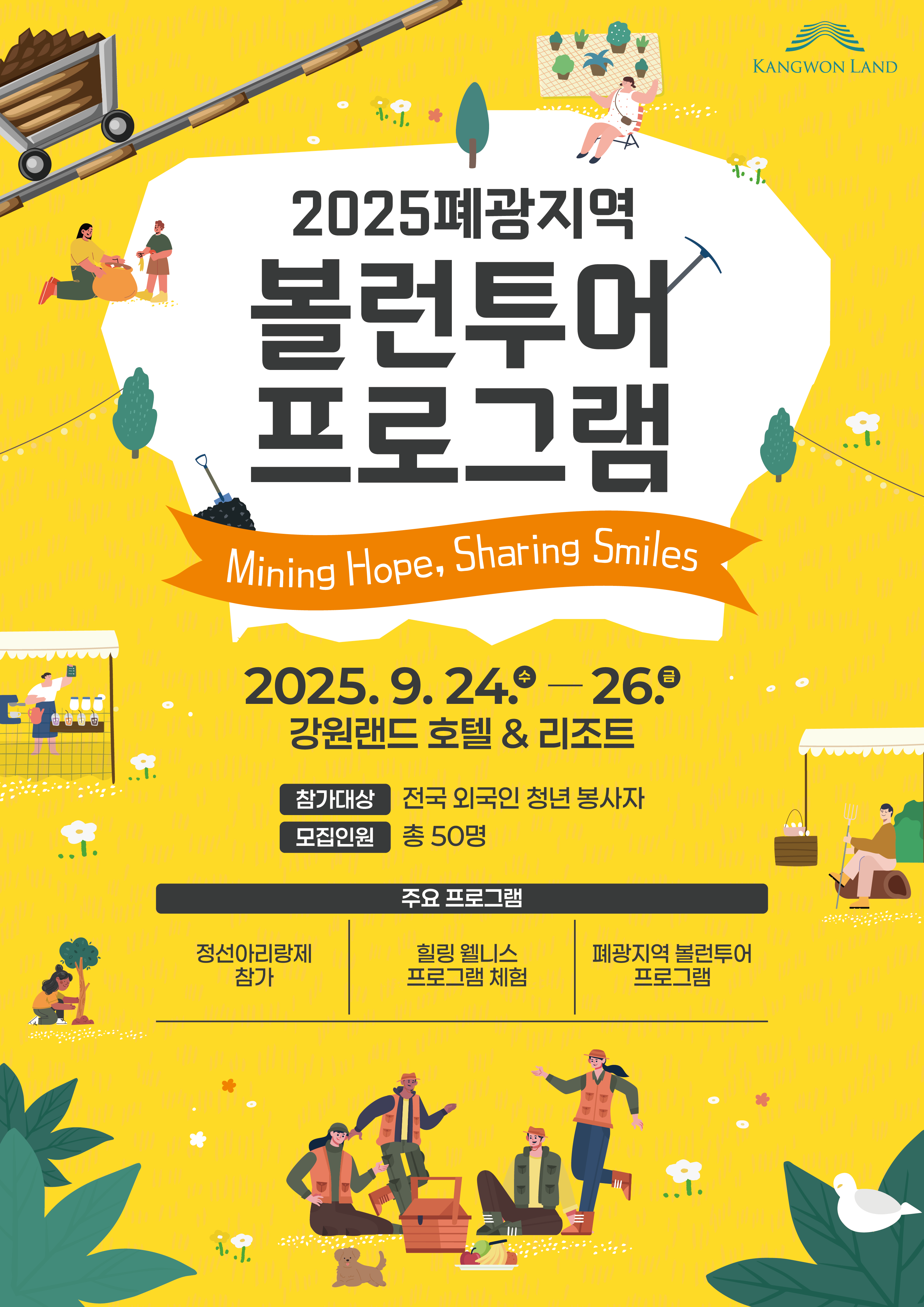 한국사회복지협의회는 ㈜강원랜드와 함께 전국 외국인 청년 봉사자를 대상으로 볼런투어(외국인 청년 자원봉사자들을 위한 맞춤형 지역상생 체험활동) 프로그램을 제공함으로써, 지역사회 회복 및 국제적 자원봉사 문화 형성에 기여하는 [2025년 강원랜드 영웅쉼터 볼런투어 프로그램]을 실시하오니 많은 추천과 신청 바랍니다.