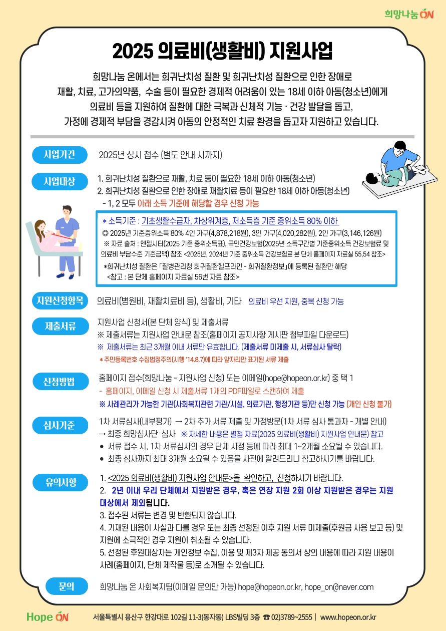 희망나눔 온에서는 희귀난치성 질환, 희귀난치성 질환으로 인한 장애로 재활, 치료, 고가 의약품 등이 필요한 경제적 어려움이 있는 18세 이하 아동(청소년)을 대상으로 『2025년 의료비(생활비) 지원사업』을 진행하고 있습니다.