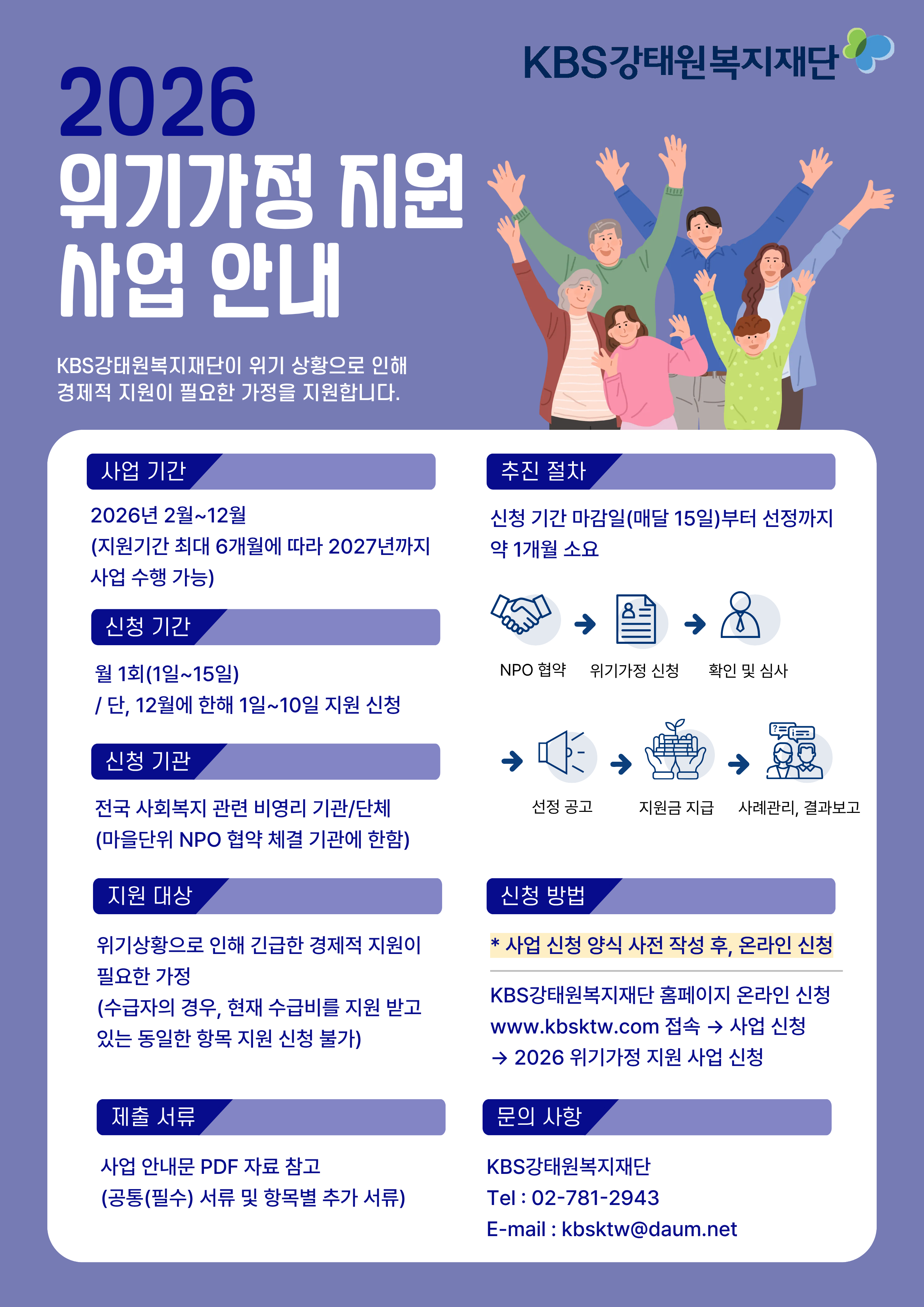 KBS강태원복지재단에서는 복지 사각지대에 있는 위기가정을 발굴하여 경제적 지원을 제공하고자