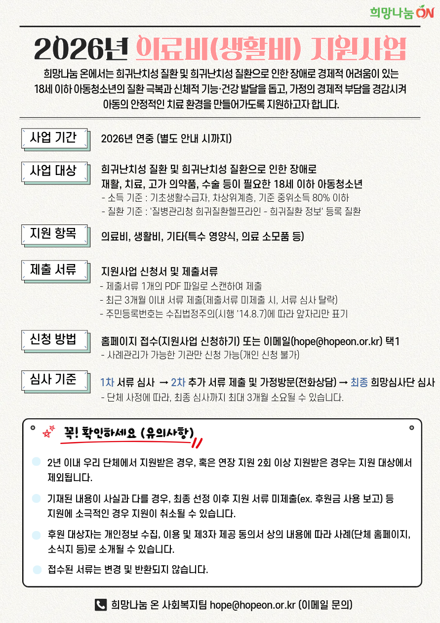 - 희망나눔 온 홈페이지 공지사항 <2026년 의료비(생활비) 지원사업 신청 안내> "바로 가기"