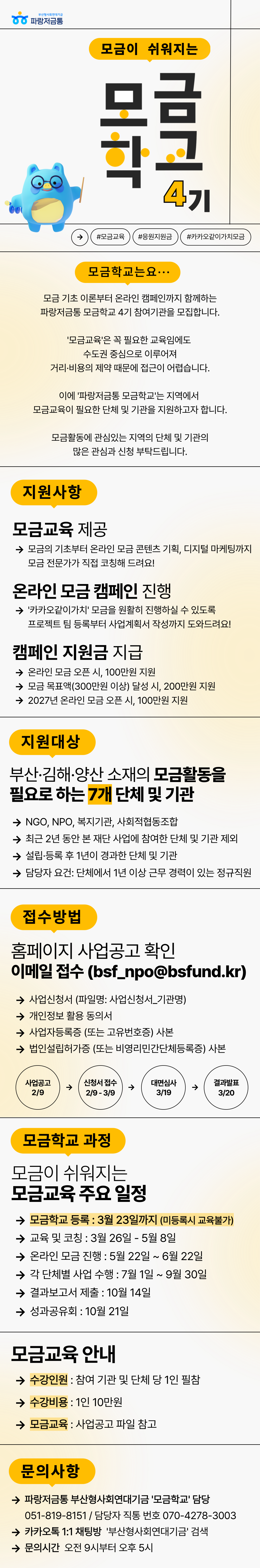 모금 기초 이론부터 온라인 모금 캠페인까지 함께하는 파랑저금통 모금학교 4기 참여기관을 모집합니다.