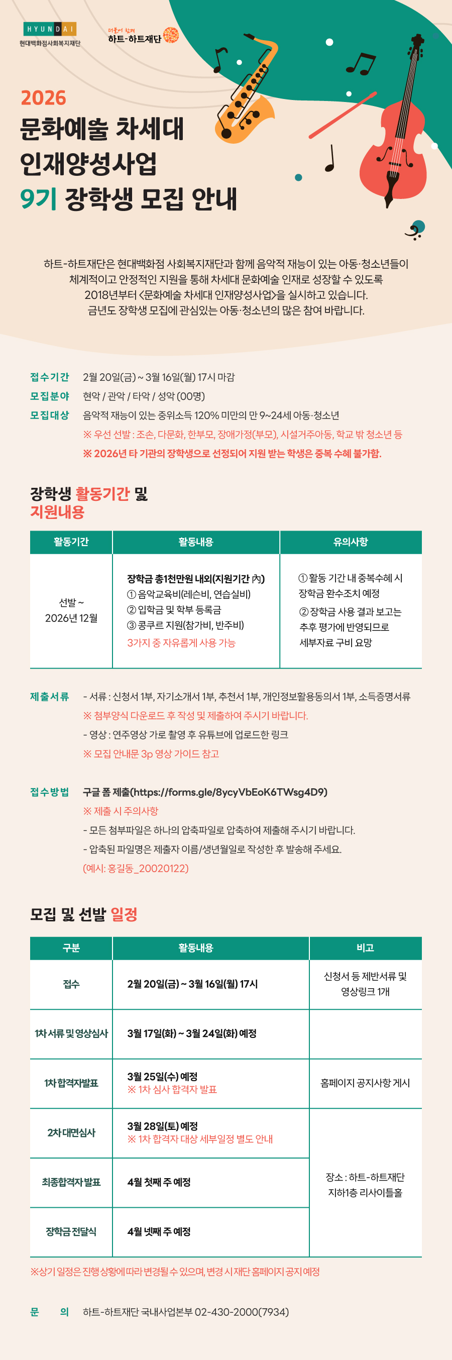 사회공헌공모 [하트-하트재단] 2026 문화예술 차세대 인재양성사업 9기 장학생 모집 안내