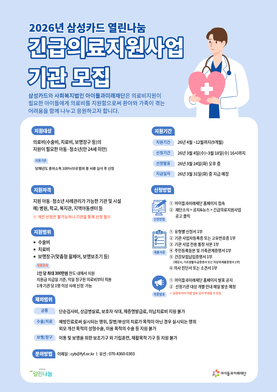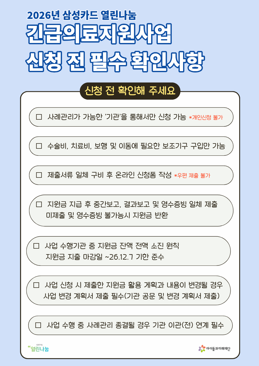 ※ 신청 자격: 의료 지원이 필요한 아동/청소년이 이용하는 비영리단체 및 병원 사회사업실 등(개인 신청 불가)