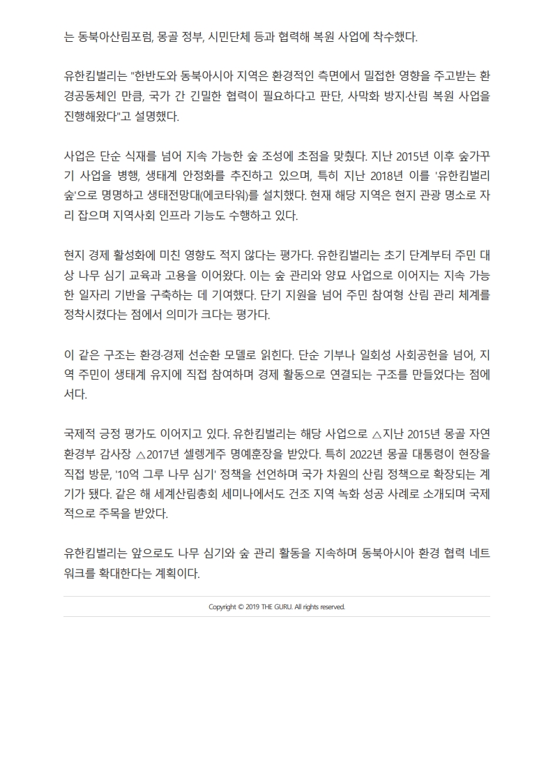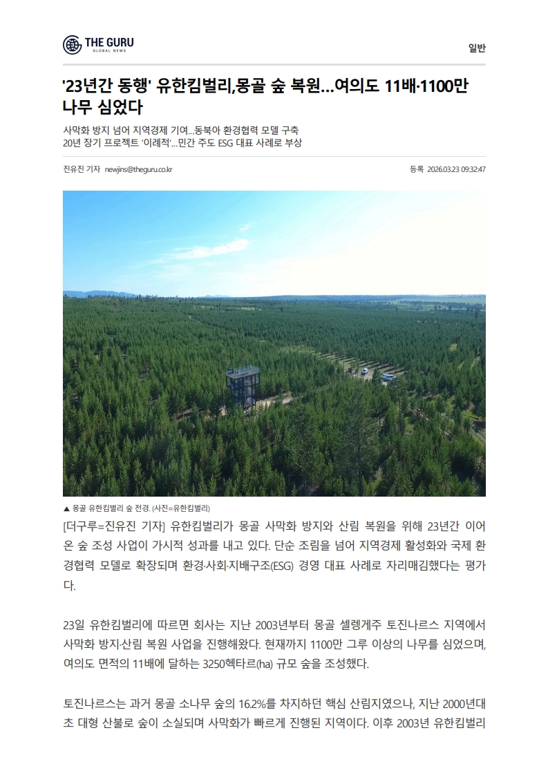 사회공헌기사 '23년간 동행' 유한킴벌리,몽골 숲 복원…여의도 11배·1100만 나무 심었다