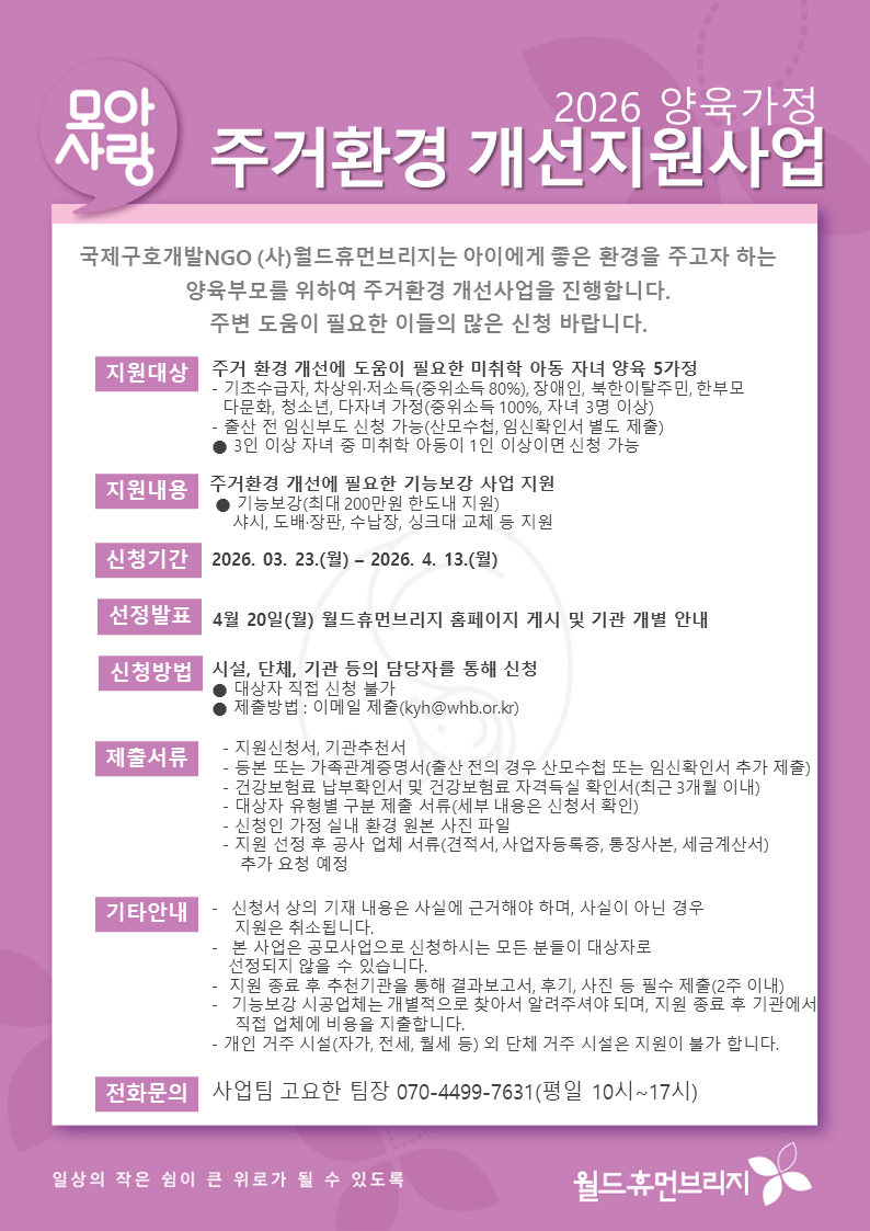 국제구호개발NGO (사)월드휴먼브리지는 아이에게 좋은 환경을 주고자 하는 양육부모를 위하여