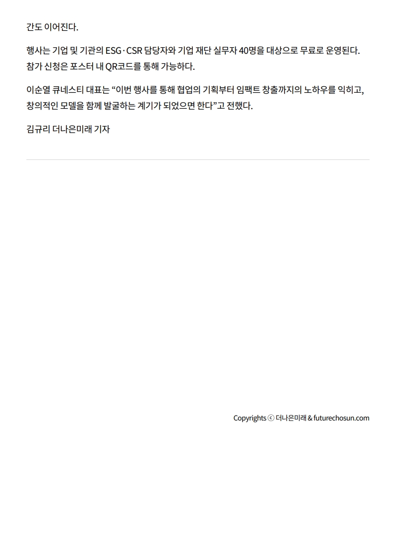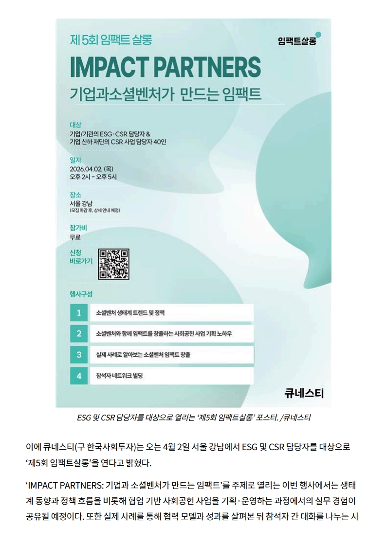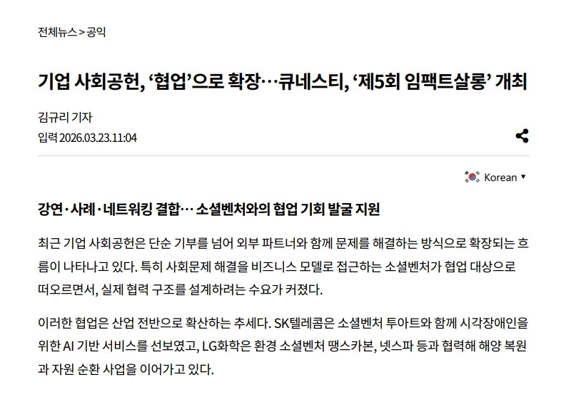 사회공헌기사 기업 사회공헌, ‘협업’으로 확장…큐네스티, ‘제5회 임팩트살롱’ 개최