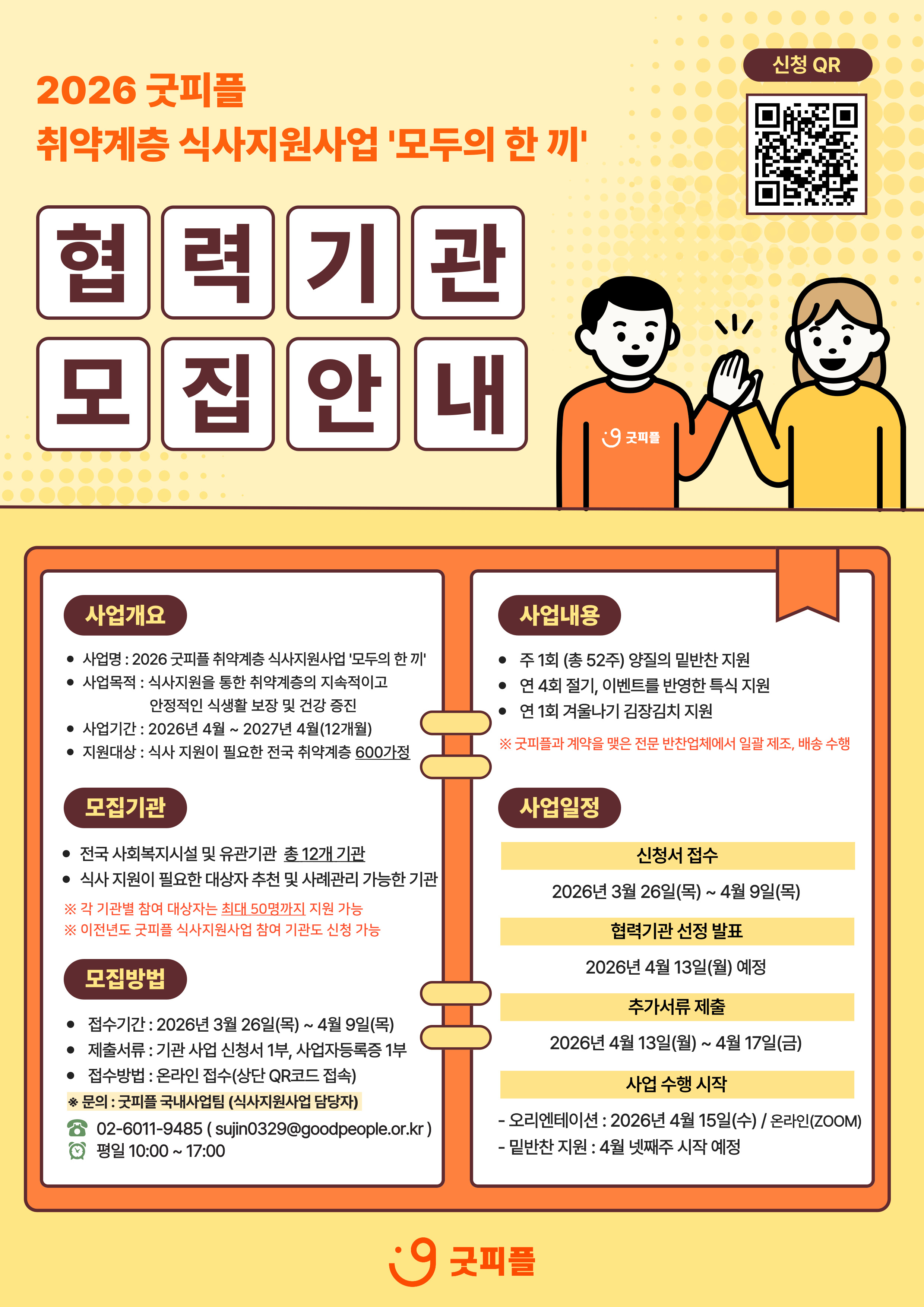 굿피플은 식사지원을 통한 취약계층의 안정적인 식생활 보장 및 신체적·정서적 건강 증진을 목적으로 2026 취약계층 식사지원사업 "모두의 한 끼"를 진행하고자 합니다. 관심 있는 기관의 많은 참여를 부탁드립니다.