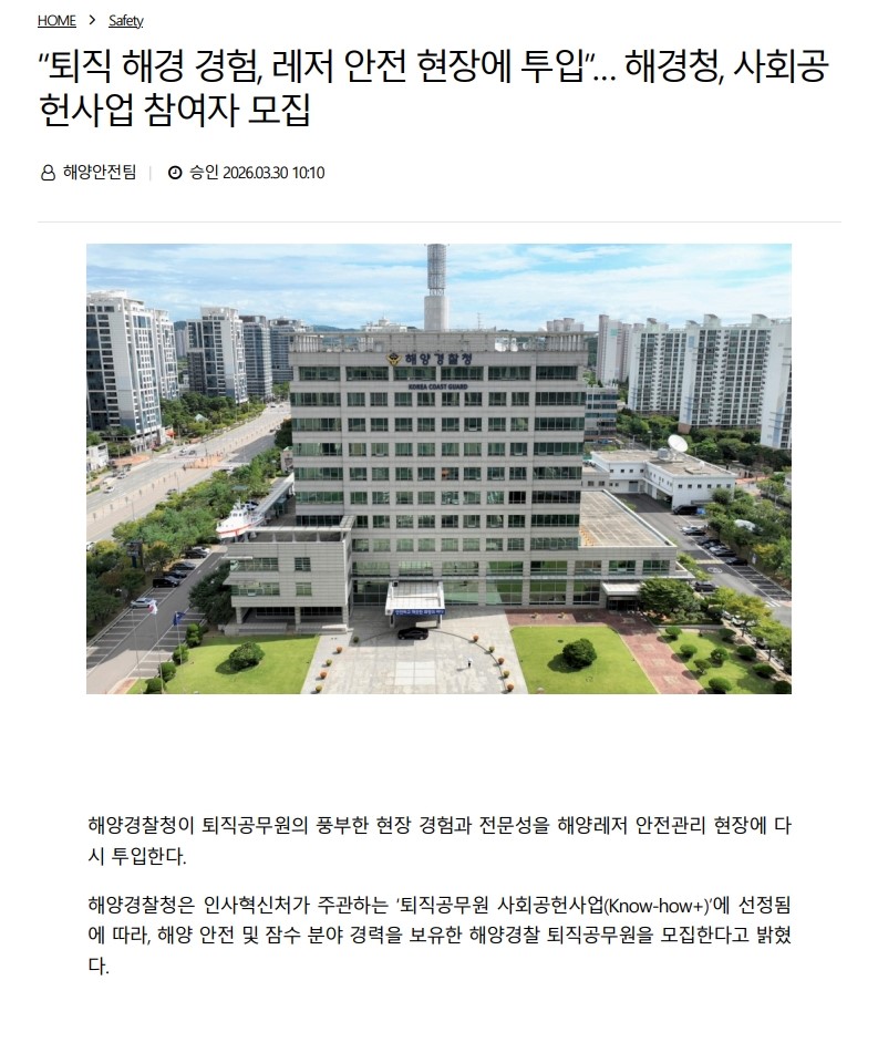 사회공헌기사 “퇴직 해경 경험, 레저 안전 현장에 투입”… 해경청, 사회공헌사업 참여자 모집