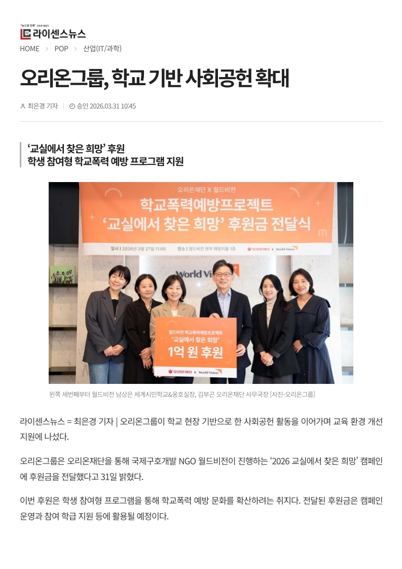 사회공헌기사 오리온그룹, 학교 기반 사회공헌 확대
