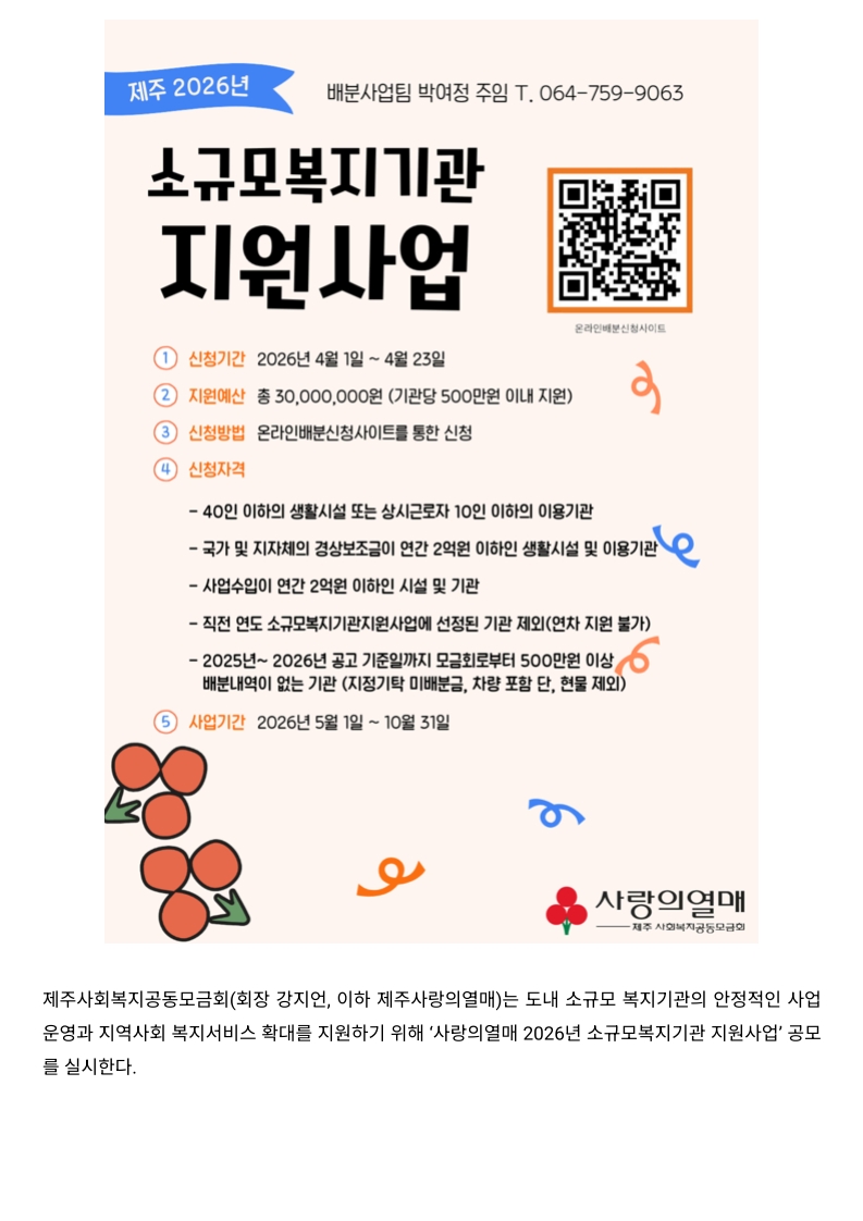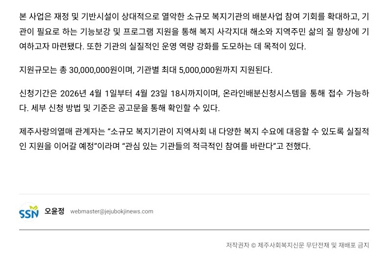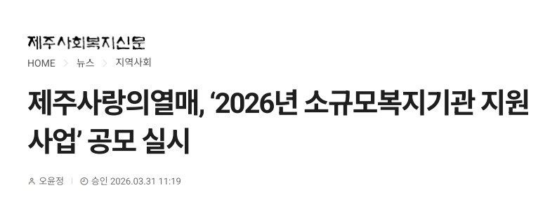 사회공헌기사 제주사랑의열매, ‘2026년 소규모복지기관 지원사업’ 공모 실시