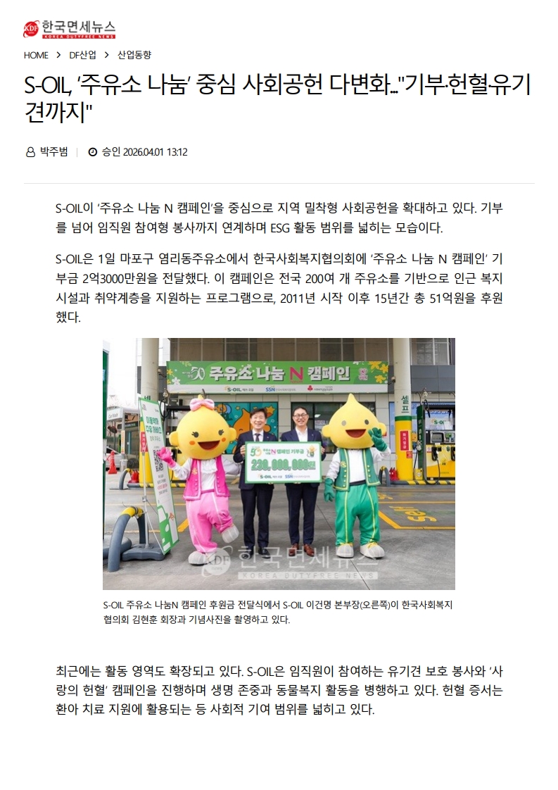 사회공헌기사 S-OIL, ‘주유소 나눔’ 중심 사회공헌 다변화..."기부·헌혈·유기견까지"